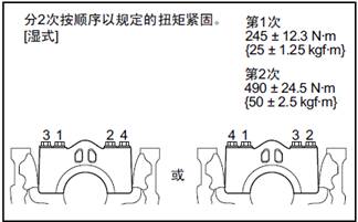 (5) 三菱S6R柴油發動機曲軸最后端部除外的三菱S6R柴油發動機主軸承瓦端蓋螺栓按照圖示順序,在規定扭矩的1/2 處一旦緊固。