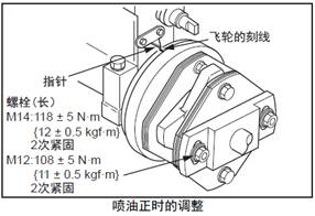 (1) 緩慢地正向盤車,使減振器上的規(guī)定噴油正時刻線和發(fā)動機的指針一致。