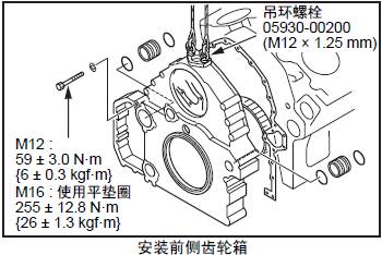 (3) 在三菱S12柴油發動機正時齒輪箱上安裝吊具,對準定位銷后,安裝三菱S12柴油發動機正時齒輪箱。