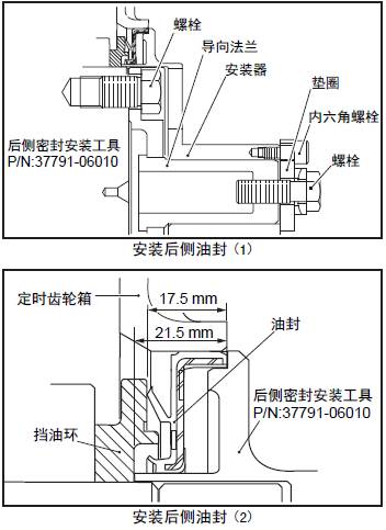(4) 旋緊導向法蘭上的螺栓,將三菱S12柴油發動機油封裝入三菱S12柴油發動機正時齒輪箱。