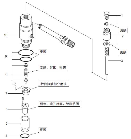(5) 調整和清洗后噴霧狀態不能好轉的話,要更換新的噴油嘴。新的噴油嘴涂有防銹劑,最初一定要用清洗油清洗,然后用柴油再次清洗后才能組裝。