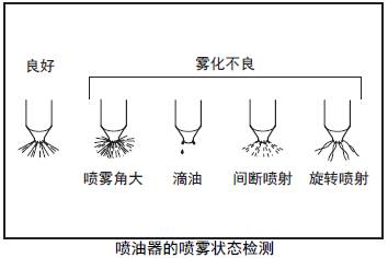 在三菱S12柴油發動機噴油器試驗臺上調整壓力的同時,檢查噴孔堵塞、噴霧狀態以及噴孔內有無漏油現象等。噴霧不良時,清洗或更換噴油嘴。