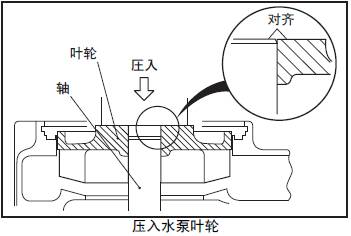 (2) 用壓力機壓入三菱S16柴油機水泵葉輪。這時,三菱S16柴油機水泵葉輪的輪轂端面要和三菱S16柴油機水泵軸的端面平齊。