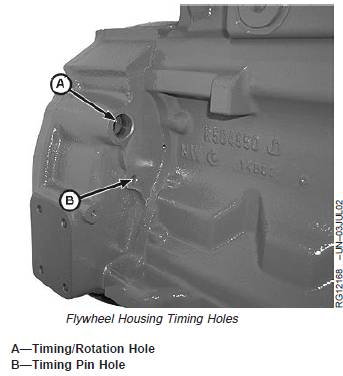 2. Remove plastic plugs or cover plate from enginetiming/rotation hole (A) and timing pin hole (B).