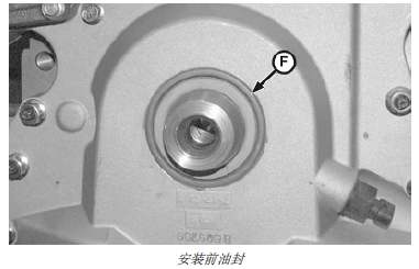 7. 將墊圈和螺母裝到轉(zhuǎn)接器上。擰緊螺母,直到油封(F) 安裝到正時(shí)齒輪蓋中正確的深度。