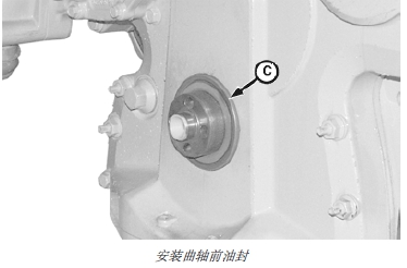 3. 在油封邊上涂上一層干凈的機(jī)油,將油封 (C) 裝在曲軸的凸緣上。(油封裝彈簧的一頭應(yīng)先裝進(jìn)正時(shí)齒輪蓋內(nèi)。)