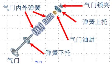 2、氣門組:氣門組包括氣門、氣門座、氣門導管、氣門彈簧、氣門鎖夾、氣門油封等零件。