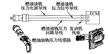 安裝在高壓燃油共軌內,其功能是:ECM利用該傳感器信號確定油軌中的燃油壓力,同時利用它來計算燃油供油量,工作范圍在0~1500 Ba,。傳感器出現故障將導致發動機動力下降、轉速降低甚至停車。