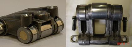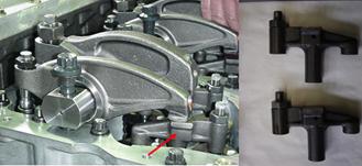 帶導向、可調整的氣門過橋實現一個搖臂驅動兩個氣門。
