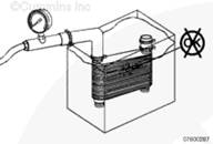 如圖所示,堵住機油冷卻器芯,并連接至壓縮空氣源。對每個機油冷卻器芯進行壓力測試,以檢查有無泄漏。