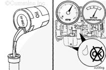 運轉發動機直到達到 80°C [180°F] 的溫度 ,檢查冷卻液或機油是否泄漏。