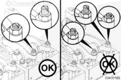 確保康明斯跨接壓板在康明斯氣門桿上牢固就位。選擇適合的塞尺設置氣門。使用維修工具(零件號 3163171(進氣))或(零件號 3163172(排氣))。確保塞尺位于套筒和球的中心下方或套筒可以搖擺或傾斜,否則將導致調整錯誤。檢查間隙時抓住旋轉套筒的平面避免讀數錯誤。調整螺釘必須能轉動自如,否則會出現錯誤讀數或設置錯誤。
