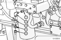 將直螺紋適配器 (1) 裝入機(jī)油濾清器座 (6) 中,其中螺塞已拆下。將 90 度彎頭 (2) 裝入適配器。將單向閥 (3) 裝入彎頭。單向閥上的箭頭必須指向彎頭,并且與油流方向一致。將陽(yáng)性軟管適配器 (4) 裝入單向閥。將預(yù)潤(rùn)滑軟管 (5) 連接到陽(yáng)性軟管適配器。