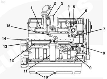 1排氣歧管,2渦輪增壓器機油進口,3渦輪增壓器,4節溫器殼通風口,5節溫器殼,6發動機冷卻液出口,7冷卻液溫度傳感器,8水泵,9冷卻液濾清器,10發動機放油口,11組合式全流/旁通機油濾清器,12機油冷卻器,13飛輪殼,14發動機生產序號(ESN),15渦輪增壓器機油回油口。