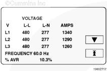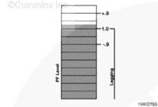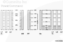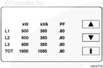 kW、kVA 和 PF 顯示發(fā)電機組的千瓦(kW)和千伏安(kVA)輸出(平均和單相以及電流方向)和有超前/滯后指示的功率因數(shù)。