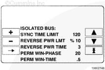 容許窗口時間 (PERM WIN-TIME):調(diào)整在 PowerCommand® 控制系統(tǒng)發(fā)出斷路器閉合信號前發(fā)電機組必須與系統(tǒng)母線保持同步的時間期限(單位:秒)。可調(diào)整的范圍是 0.5 至 5 秒。對于隔離母線的建議值是 0.5 秒。(將控制系統(tǒng)調(diào)整為更小的同步檢查窗口或更長的延時會造成同步時間延長。)