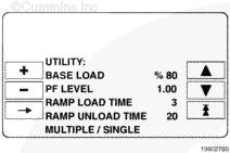 基本負(fù)載 (%) 控制發(fā)電機組與公用電網(wǎng)(干線)并聯(lián)運轉(zhuǎn)時的最大 kW 負(fù)載水平。顯示的數(shù)值表明發(fā)電機穩(wěn)態(tài)負(fù)載在發(fā)電機組備載規(guī)格中所占的百分比。在超出發(fā)電機組規(guī)格的負(fù)載水平下長期運行可能會造成發(fā)動機異常磨損或過早損壞。