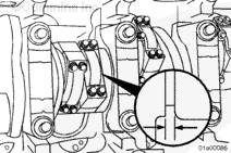 安裝連桿時,連桿(右排和左排)上壓印的缸號必須朝向左排凸輪軸。如果連桿安裝得不正確,可能導(dǎo)致發(fā)動機損壞。