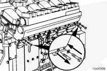 將密封墊安裝在左排中冷器供應管和回水管的端部。安裝螺栓。扭矩值: 65 n.m [48 ft-lb]