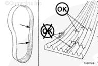 檢查皮帶張緊器皮帶輪上傳動皮帶的位置。皮帶應位于皮帶輪的中間,或靠近中間。未對準的皮帶、無論太靠前或太靠后,都可能造成皮帶磨損、皮帶滾動故障或增加不均勻的張緊器襯套磨損。