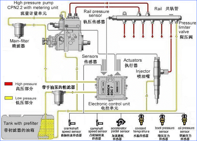 濰柴動力國三電控柴油機故障診斷及排除 造成柴油發動機的故障原因 濰柴國三柴油機是在嚴格的質量保證體系下設計和生產制造的,每一臺出廠的柴油機都經過規定的測試。同時柴油機又是一種精密機械,其功效要得到長久保證,與正常的維護保養密不可分。引起柴油機早期失效,一般有以下幾個原因: 1.違章操作,管理和使用不善; 2.不按規定進行維護和保養甚至以修代養; 3.配件制造不良,特別是貪圖便宜購買到假冒偽劣產品,將大大縮短柴油機的壽命; 4.燃油和潤滑油牌號選用不當或不合格 . 柴油機故障診斷原則和方法 柴油機故障成因復雜,有時故障顯現是類似的,但產生原因并非一樣。為提高故障診斷的準確性,避免或少走彎路,建議客戶按以下原則判斷處理故障: 針對特征,聯系原理; 弄清現象,不漏點滴; 由簡到繁,由表及里; 按系分段,檢查分析。 柴油機故障常用的診斷方法一般有: 1)觀察法:通過觀察柴油機的排煙等故障特征,判斷故障情況(圖1 ) 2)聽診法:根據柴油機異常聲音憑聽覺判斷故障部位性質及程度(圖2) 3)斷缸法:停止某缸工作,借以判斷故障是否出現在該缸。斷缸法一般是向懷疑出現故障的氣缸停止供油,比較斷缸前后發動機的狀態變化,為進一步查找故障部位或原因縮小范圍 4)比較法:對某些總成或零部件,采用更換的辦法確定是否存在故障 以上為機械方面故障的判斷方法,在國三柴油機上同樣適用,機械故障可參照國二故障排除方法排除 5)故障診斷燈:當車出現故障時,可以通過整車儀表盤上的閃碼燈讀出閃碼,參照閃碼表初步判斷錯誤原因 6)專用工具:故障診斷儀故障診斷儀可以進行較進一步的判斷 故障一:柴油機不能起動 柴油機是壓燃式內燃機。柴油機的順利起動,不僅需要大量燃油充分霧化后噴入氣缸,而且要求氣缸內空氣壓縮后具有一定的溫度和壓力,這樣才能使柴油自燃。因此柴油機不能順利起動,原因一般在起動系統、電控燃油系統、進排氣系統或柴油機配合間隙上。客戶可根據故障的伴隨特征,按步驟進行分析判斷。 1.1 起動機不工作 對于起動機受ECU控制的整車,在啟動時ECU首先檢查空檔信號,然后輸出一個電流驅動起動繼電器,繼電器接通后電瓶帶動起動機起動。 檢查時有幾個要素:空檔開關、起動繼電器、電瓶、車下停車開關的關聯 Ø 檢查是否掛在空檔位置 Ø 檢查車下停車開關的位置(應處于斷開狀態) Ø 檢查空檔開關(一般安裝在變速箱上)及接線是否完好,試著使用緊急起動(點火開關持續按下5秒以上) Ø 檢查電瓶電壓是否過低,以致不能帶動起動機 Ø 起動機繼電器及接線是否完好 Ø 檢查起動機是否已燒壞 Ø 點火開關及起動開關是否已壞 1.2 軌壓無法建立(起動機能正常工作,但無法起動) 共軌系統對燃油油路要求較高,低壓油路(油箱 粗濾 精濾,回油)、高壓油路(高壓油泵 共軌高壓油管 噴油器)都要保證密閉。任何一個環節出了問題,軌壓都不能正常建立,提示主機廠對整個燃油油路高度重視。 Ø 檢查油箱油位是否過低 Ø 檢查手壓泵是否工作正常 Ø 檢查低壓油路是否有氣,并排空氣(有時低壓油路泄漏不明顯,需要仔細檢查) 排氣方法:主要排粗濾里面的空氣。松開粗濾上的放氣螺栓,用手壓動粗濾器上的手壓泵,直至放氣螺栓處持續出油為止 Ø 低壓油路空氣排凈后仍不能起動柴油機,則判斷高壓油路有空氣,也需要排出高壓油路的空氣 排氣方法:松開某缸高壓油管,用起動機帶動柴油機運轉直至高壓油管持續出油為止!(不建議經常拆卸高壓油管接頭!) Ø 檢查高壓油路有無泄漏 Ø 檢查油路是否通暢,檢查柴油濾清器是否堵塞,建議及時更換柴油濾芯 檢查方法:松開精濾出口螺栓,用起動機帶動柴油機運轉,看是否有柴油噴出或流出,若只有少量柴油流出,則可以判定濾芯堵塞 Ø 檢查軌壓傳感器初始電壓值是否在500mV左 右,或設定軌壓是否為300-500bar(用KTS故障診斷儀),若不正常首先檢查接插件是否牢靠。若無檢查設備,可以拔掉軌壓傳感器接插件嘗試再起動 Ø 檢查流量計量單元是否完好,拔掉接插件嘗試再起動 1.3 噴油器線束、傳感器線束、整車線束接插件未插好或者線束斷路或短路 Ø 檢查接插件的安裝,用萬用表(最好接 線路檢查儀) 按照線路圖的指針定義檢查線路的通斷 1.4 曲軸信號和凸輪軸信號喪失 柴油機上安裝兩個轉速傳感器,分別在飛輪殼和高壓油泵外側。功能分別為:曲軸位置傳感器和判缸傳感器。電控發動機的噴油正時取決于這兩個傳感器。出現柴油機不能起動情況,兩個信號全部丟失 Ø 兩信號全部丟失可能的原因 ①傳感器損壞,線束短路或斷路 ②傳感器固定不牢,造成傳感器與感應齒之間間隙過大或過小(一般為1±0.5mm) 排除方法:檢查傳感器是否損壞,線束是否連接良好,傳感器是否松動等 注:拆裝高壓油泵及飛輪后的安裝應嚴格按照相關工藝文件執行,以確保信號同步 故障二:柴油機啟動困難 Ø 柴油機啟動困難的原因及排除方法 ①柴油機較長時間沒有運轉:回油管要伸在柴油液面下 ②低壓管路有少量空氣:排氣 ③曲軸轉速信號、凸輪軸信號太弱,同步判斷時間較長:重新調整 ④環境溫度太低,并且預熱裝置失效:更換預熱裝置 ⑤柴油、機油品質太差未達標:更換標準油品 ⑥起動機或飛輪齒圈打齒:更換起動機及飛輪齒圈 ⑦活塞環、缸套磨損或氣門密封不嚴:更換活塞環、缸套或氣門座、氣門 ⑧排氣制動
