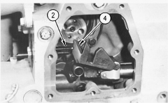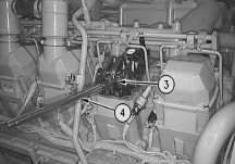 3. Turn the governor or the actuator terminal shaft to the fuel ON position until the flat face of fuel stop lever (4) contacts synchronization pin (2). This is the synchronizing position or zero reference point. Hold the control linkage in this position when the injectors are adjusted.