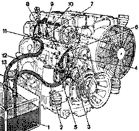 1.油箱,2.通柴油泵的油路,3.柴油泵,4.通柴油濾清器的油器,5.柴油濾清器,6.通噴油泵的油路,7.噴油泵,8.通噴油器的油路,9.噴油器,10.回油管,11帶壓力控制閥的油管螺栓,12.回油箱的油路,13.這個距離盡可能的大