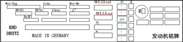 • 1、發(fā)動(dòng)機(jī)型號(hào);3、發(fā)動(dòng)機(jī)順序號(hào);4、額定功率;6、額定轉(zhuǎn)速;7、噴油角;16、EP值;