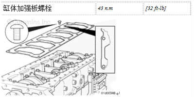 注: 對于有些油底殼/吸油管的配置,其中有一個缸體加強板的安裝螺栓與其余螺栓不同。這個有低螺栓頭的的螺栓應安裝在與吸油管安裝位置相鄰的開口處。有些應用中使用低螺栓頭的螺栓可確保吸油管和缸體加強板安裝螺栓之間有足夠的間隙。