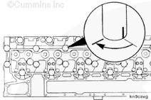 使用螺栓長(zhǎng)度尺(零件號(hào) 3823921)檢查所有缸蓋螺栓的長(zhǎng)度是否正確。