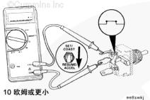 無論開關在什么位置,萬用表都必須顯示為開路特征(100 千歐或更大)。如果電路沒有開路,則開關故障。關于更換步驟,參考 OEM 故障判斷和排除手冊。