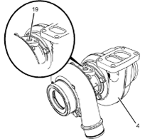12.從進(jìn)油口(19)處拆下螺塞。請(qǐng)參閱插圖54。用清潔的發(fā)動(dòng)機(jī)機(jī)油通過進(jìn)油口潤滑Perkins1106A/C發(fā)動(dòng)機(jī)渦輪增壓器軸承。將壓縮機(jī)葉輪轉(zhuǎn)動(dòng)幾次以便潤滑軸承。