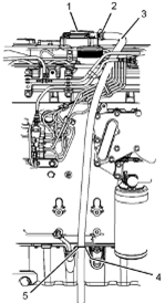 6將軟管(3)連接到Perkins1106A/C發動機氣門機構蓋(1)和Perkins1106A/C發動機曲軸箱呼吸器的濾清器座(5)上。