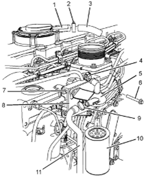 1拆下呼吸器的濾罐(10)。請參閱《Perkins1106A/C發動機操作和保養手冊》,“Perkins1106A/C發動機曲軸箱呼吸器(濾罐)-更換”。
