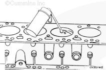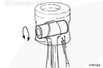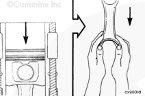 康明斯ISB5.9 G CM2180發動機活塞和連桿總成 概述 TOC 與康明斯ISB5.9 G CM2180發動機功率有關的問題有很多,包括機油消耗過大、冒煙、竄氣和性能不良,它們可能由活塞環與缸壁之間的密封不良引起。A 竄氣測量值有助于發現問題。參考第 14 節中的步驟 014-002。 連接康明斯ISB5.9 G CM2180發動機活塞和連桿的活塞銷采用自由浮動的中空活塞銷。已經完成從活塞冷卻噴嘴通過滯留噴霧的方法潤滑銷和軸頸。 康明斯ISB5.9 G CM2180發動機連桿的活塞銷端帶有切削角度,以增加軸承受力面積。連桿端頭裝有青銅襯套。 準備步驟 警告 為了減小人身傷害的可能性,應避免皮膚直接接觸熱機油。 警告 冷卻液有毒。避免兒童與寵物接觸冷卻液。如果不再繼續使用,應按照當地環保法規進行處理。 排放機油。參考第 7 節中的步驟 007-025。 拆下油底殼和密封墊。參考第 7 節中的步驟 007-025。 排放冷卻液。參考第 8 節中的步驟 008-018。 拆下缸蓋。參考第 2 節中的步驟 002-004。 拆卸 TOC 根據康明斯ISB5.9 G CM2180發動機氣缸位置標記每個連桿蓋。 使用康明斯ISB5.9 G CM2180 發動機盤車工具(零件號 3824591)旋轉曲軸,直到活塞位于積碳下方(可在活塞環行程區域的上方找到)。 注意 不要用砂布或砂紙去除缸孔上的積碳。來自這些材料的氧化鋁或硅微粒會嚴重損壞康明斯ISB5.9 G CM2180 發動機。 用刮刀或鈍邊工具松動積碳。不要讓刮刀損壞缸套。 注: 在清潔缸孔時,執行圓柱運動,不是垂直運動,確保不造成泄漏通道。 用 Scotch-Brite 清潔墊或等同物清除剩余的積碳。 拆下康明斯ISB5.9 G CM2180發動機螺釘、連桿蓋和連桿軸承。參考第 1 節中的步驟 001-005。 將康明斯ISB5.9 G CM2180發動機連桿和活塞總成推出缸孔。注意不得損壞連桿或軸承。 用雙手取出活塞和連桿總成。 注: 活塞和連桿總成必須安裝在與拆卸時相同的氣缸上。如果要繼續使用這些零件,這樣會使磨損的配合面正確配合。 使用標簽標記拆下的活塞和連桿總成所屬的缸號。 將康明斯ISB5.9 G CM2180發動機連桿和活塞總成放入容器中以免損壞。 解體 TOC 使用康明斯ISB5.9 G CM2180發動機活塞環擴張器(零件號 3823137)拆卸活塞環。參考第 1 節中的步驟 001-047。 拆卸康明斯ISB5.9 G CM2180發動機卡環。 拆下康明斯ISB5.9 G CM2180發動機活塞銷。 注: 不需要加熱活塞。 組裝 TOC 確保活塞上的前標志以及連桿和連桿蓋上的數字的方向如圖所示。 將康明斯ISB5.9 G CM2180發動機卡環安裝到活塞前側的活塞銷槽中。 用清潔的燃氣康明斯ISB5.9 G CM2180 發動機機油潤滑活塞銷及銷孔。 安裝康明斯ISB5.9 G CM2180發動機銷。 注: 安裝活塞銷時無需加熱活塞,但活塞必須在室溫或室溫以上。 安裝康明斯ISB5.9 G CM2180發動機第二個活塞銷卡環。 安裝 TOC 將康明斯ISB5.9 G CM2180發動機軸瓦裝入連桿和連桿蓋中。確保軸瓦上的定位舌位于連桿蓋和連桿的槽中。 用一薄層清潔的康明斯ISB5.9 G CM2180 發動機機油潤滑連桿軸承。 安裝康明斯ISB5.9 G CM2180發動機活塞環。參考第 1 節中的步驟 001-047。 使用清潔的燃氣康明斯ISB5.9 G CM2180 發動機機油潤滑活塞環和活塞裙。 放置各個康明斯ISB5.9 G CM2180發動機活塞環,使每個活塞環開口相互成 120 度。 注意 如果使用帶式活塞環壓縮器,確保帶的內側沒有掛在活塞環的缺口并折斷活塞環。 將康明斯ISB5.9 G CM2180發動機活塞環壓縮器(零件號 3823290)安裝到活塞上。 康明斯ISB5.9 G CM2180發動機壓縮活塞環。 使用清潔的燃氣康明斯ISB5.9 G CM2180 發動機機油潤滑缸孔。 使用康明斯ISB5.9 G CM2180 發動機盤車工具(零件號 3824591),將要安裝的活塞連桿軸頸置于下止點。 注意在插入連桿時不要損壞缸壁。 將康明斯ISB5.9 G CM2180發動機活塞和連桿總成裝入缸孔,活塞上的前標記朝向缸體前部。 小心地將活塞推入缸孔,同時將連桿引導至曲軸軸頸處。 用清潔的康明斯ISB5.9 G CM2180 發動機機油潤滑螺紋和連桿螺釘頭的下部。 注: 印在連桿和連桿蓋間分型線上的編號必須匹配,并安裝在康明斯ISB5.9 G CM2180 發動機機油冷卻器側。 將康明斯ISB5.9 G CM2180發動機連桿蓋和螺釘安裝到連桿上。 交替擰緊 2 顆螺釘。 Torque Value: 30 n.m [22 ft-lb] 60 n.m [44 ft-lb] 順時針轉動 60 度。 注: 不要測量連桿蓋與曲軸間的間隙。 用塞尺測量康明斯ISB5.9 G CM2180發動機連桿與曲軸間的側隙。 曲軸必須能夠轉動自如。如果連桿未正確定位(定位舌正對凸輪軸),就會與凸輪軸接觸從而鎖死康明斯ISB5.9 G CM2180 發動機。 安裝康明斯ISB5.9 G CM2180發動機連桿蓋時檢查能否轉動自如。如果曲軸不能轉動自如,檢查連桿的安裝和軸承尺寸。 最后步驟 警告 為了減小人身傷害的可能性,應避免皮膚直接接觸熱機油。 警告 冷卻液有毒。避免兒童與寵物接觸冷卻液。如果不再繼續使用,應按照當地環保法規進行處理。 安裝康明斯ISB5.9 G CM2180發動機油底殼和密封墊。參考第 7 節中的步驟 007-025。 安裝康明斯ISB5.9 G CM2180發動機缸蓋。參考第 2 節中的步驟 002-004。 加注康明斯ISB5.9 G CM2180 發動機冷卻系統。參考第 8 節中的步驟 008-018。 用清潔的機油注滿康明斯ISB5.9 G CM2180 發動機。參考第 7 節中的步驟 007-025。 運轉康明斯ISB5.9 G CM2180 發動機,使之達到正常工作溫度,檢查有無泄漏。