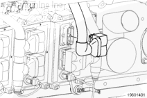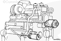 拆卸康明斯中冷器隔熱罩。參考第 10 節中的步驟 010-129(中冷器隔熱罩)。