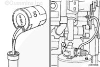 排放康明斯發動機冷卻液。參考第 8 節中的步驟 008-018(冷卻系統)。